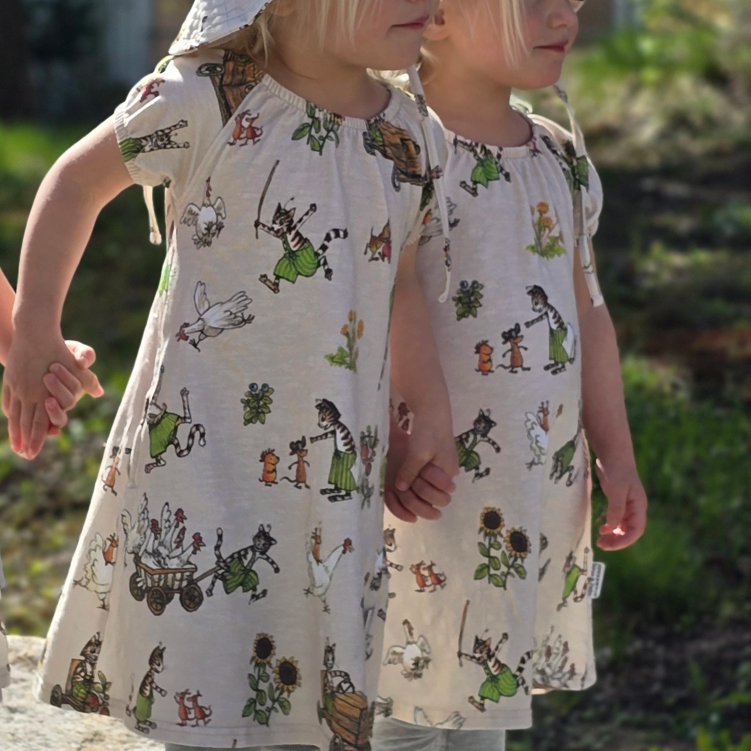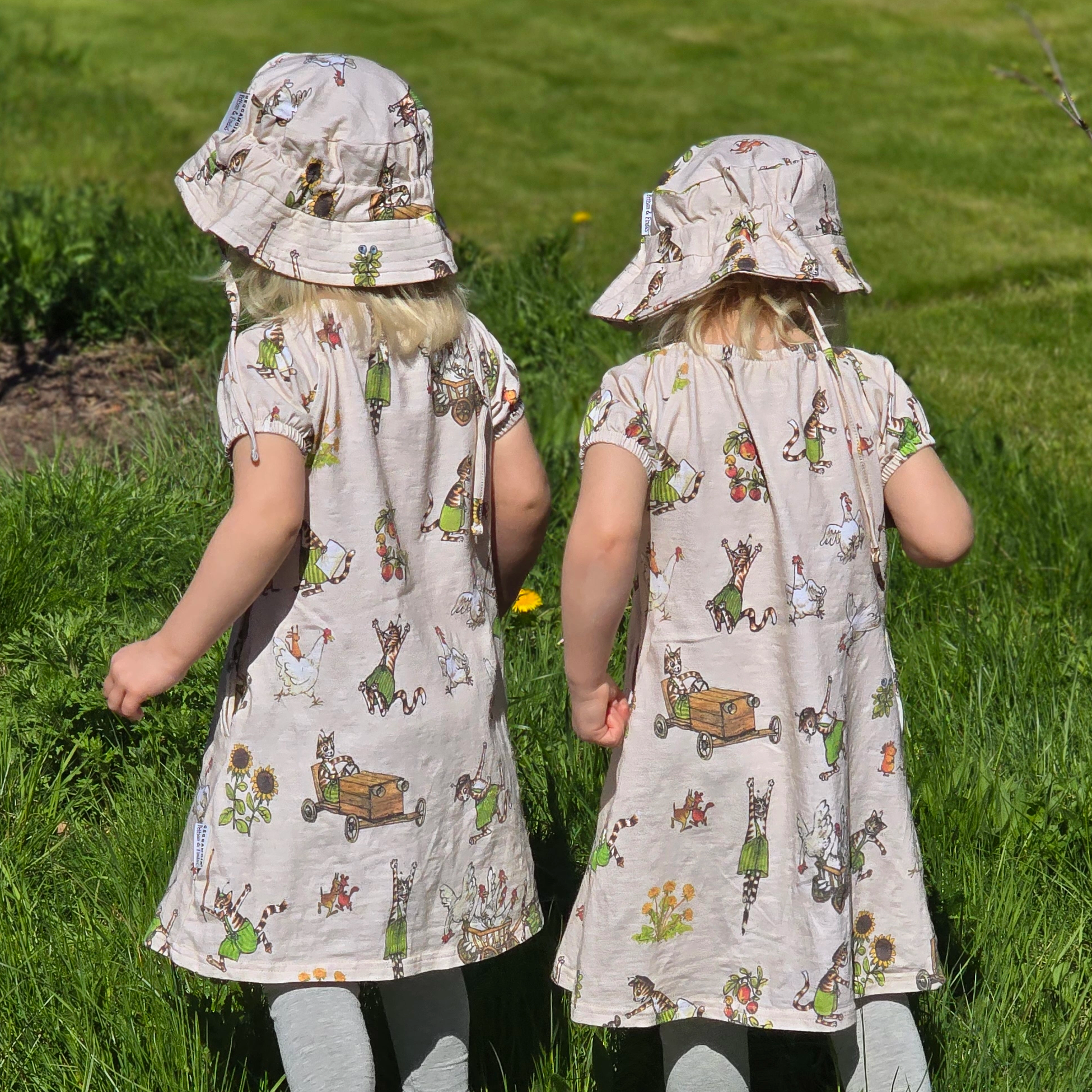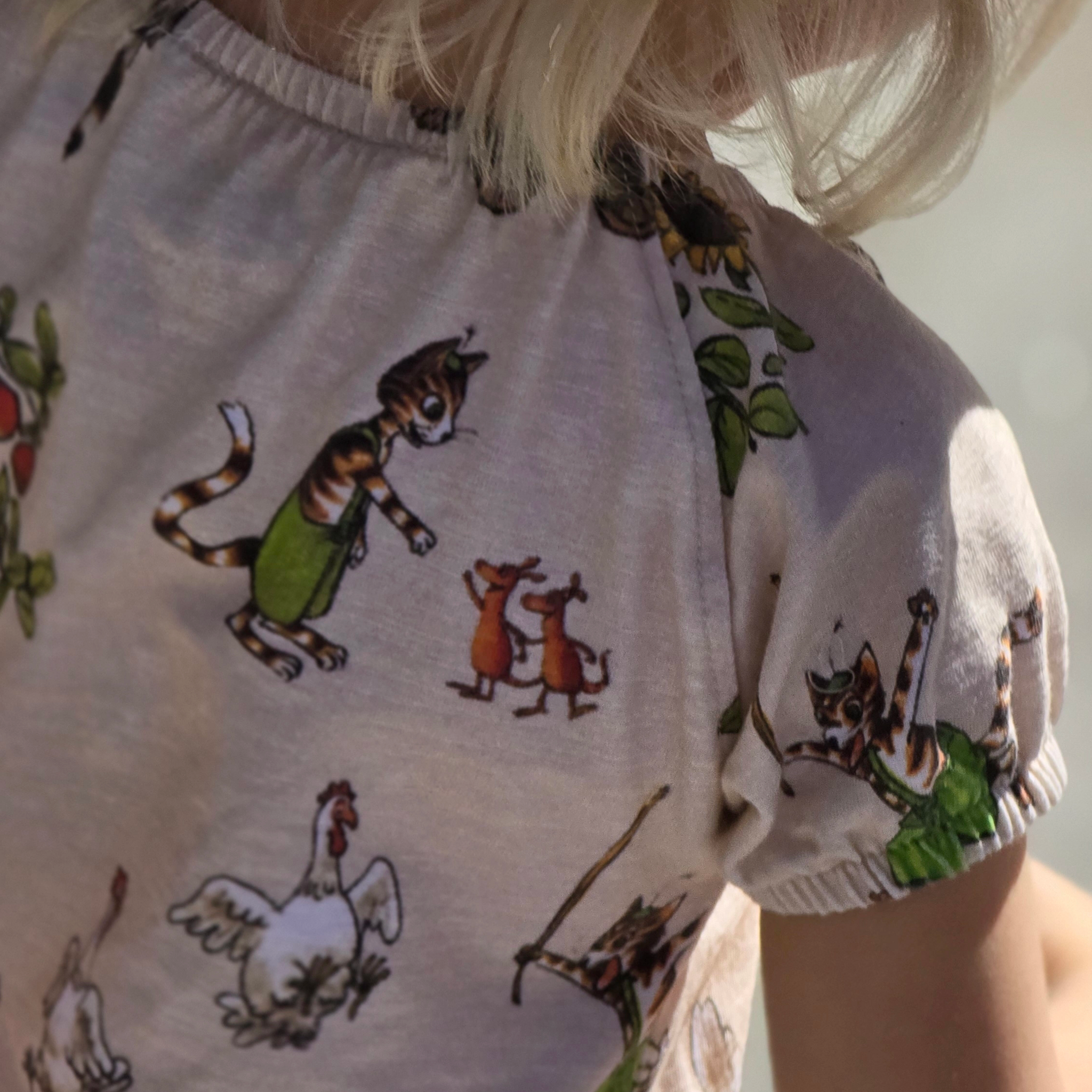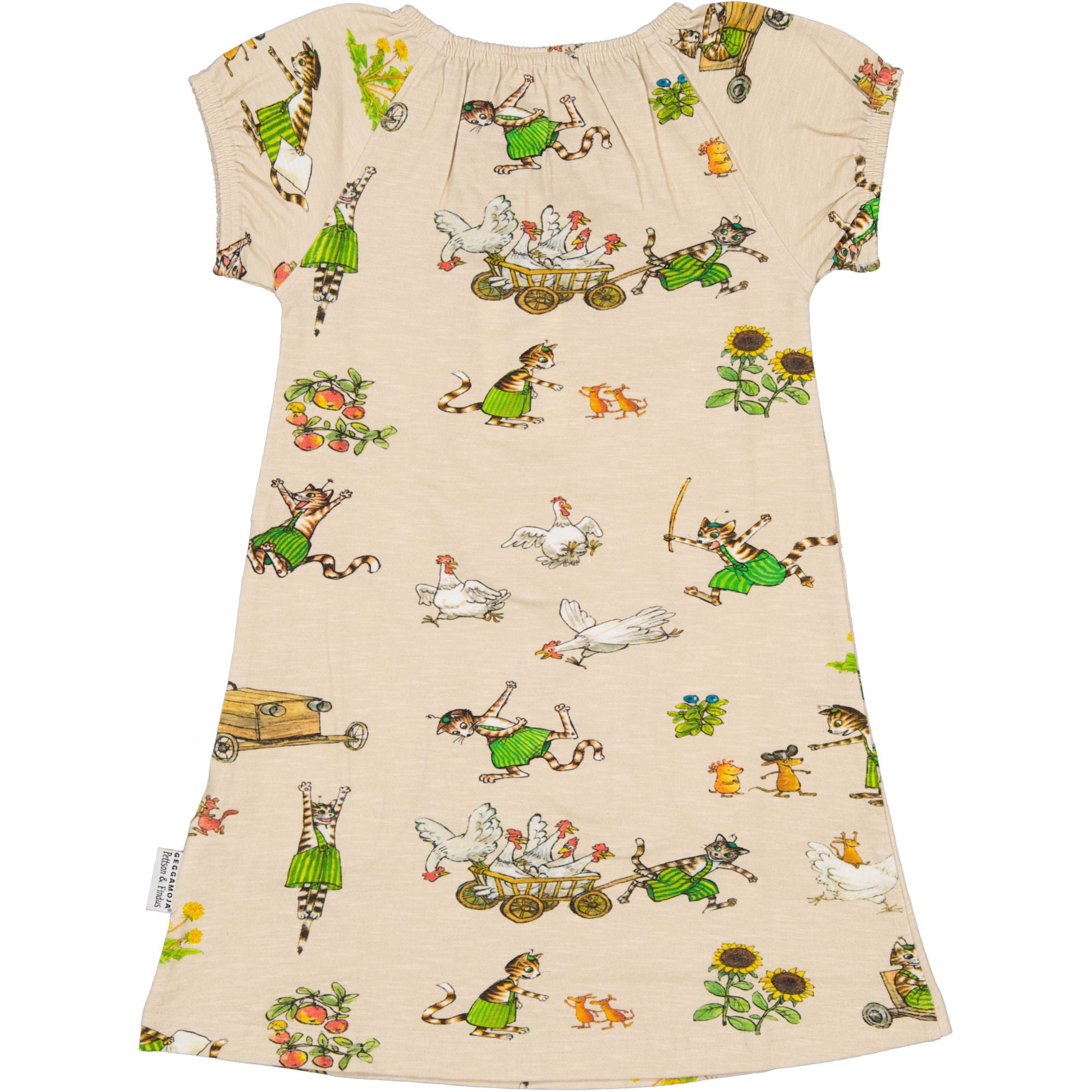 Kjølig og behagelig kjole i singoallamodell. Kjolen er laget av økologisk bomull med Pettson & Findus-trykk. Den har to lommer i sidene som rommer mange hemmeligheter.