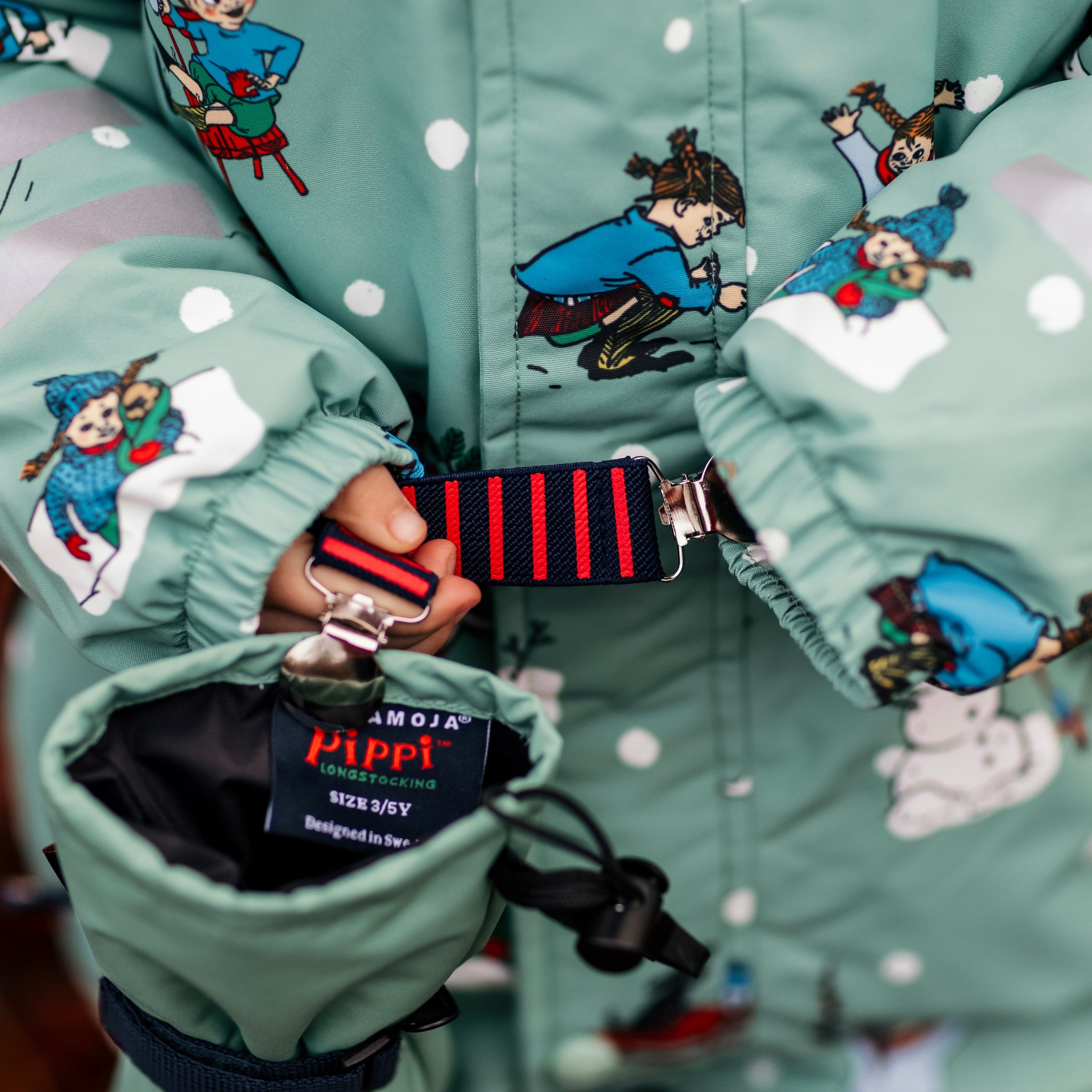Med smidige clips fester du enkelt vottene i jakkeermene, så små rampete hender kan leke fritt uten at vottene stikker av på egne eventyr. En smart, leken og Pippi-klok måte å slippe kalde fingre og vottejakt på vei ut døren!