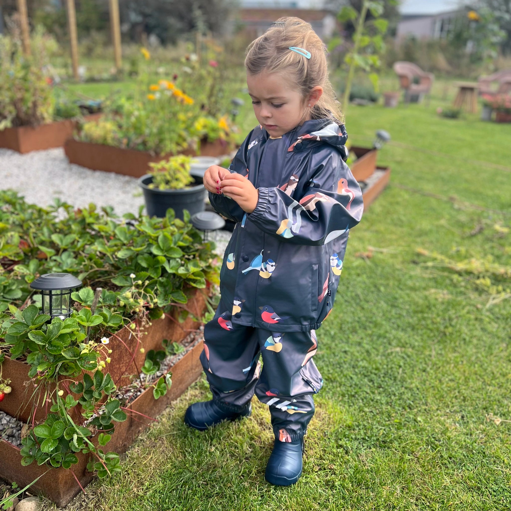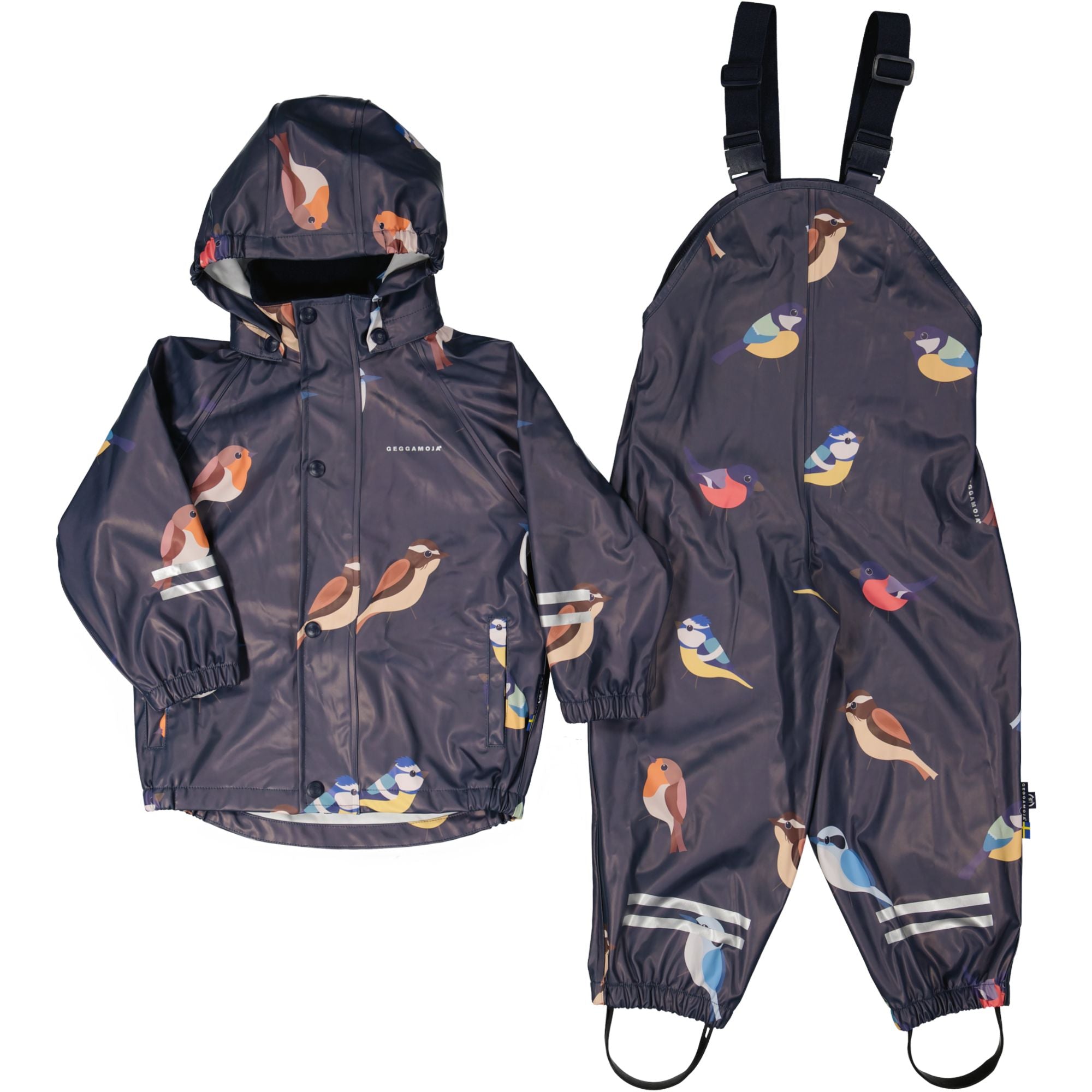 Hold barnet tørt i en regndress fra geggamoja. Regn og ruskevær? Ingen problem med denne funksjonelle regndressen som holder barnet tørt og komfortabelt, enten det er regnlek, skogstur eller en skikkelig våt tur til barnehagen. Refleksdetaljer på både jakke og bukse sørger for at barnet synes selv når lyset er svakt. Den høyere buksemodellen er komfortabel og gir beskyttelse mot glipper. Justerbare seler og en justerbar midje med knapper gjør at passformen enkelt kan tilpasses.