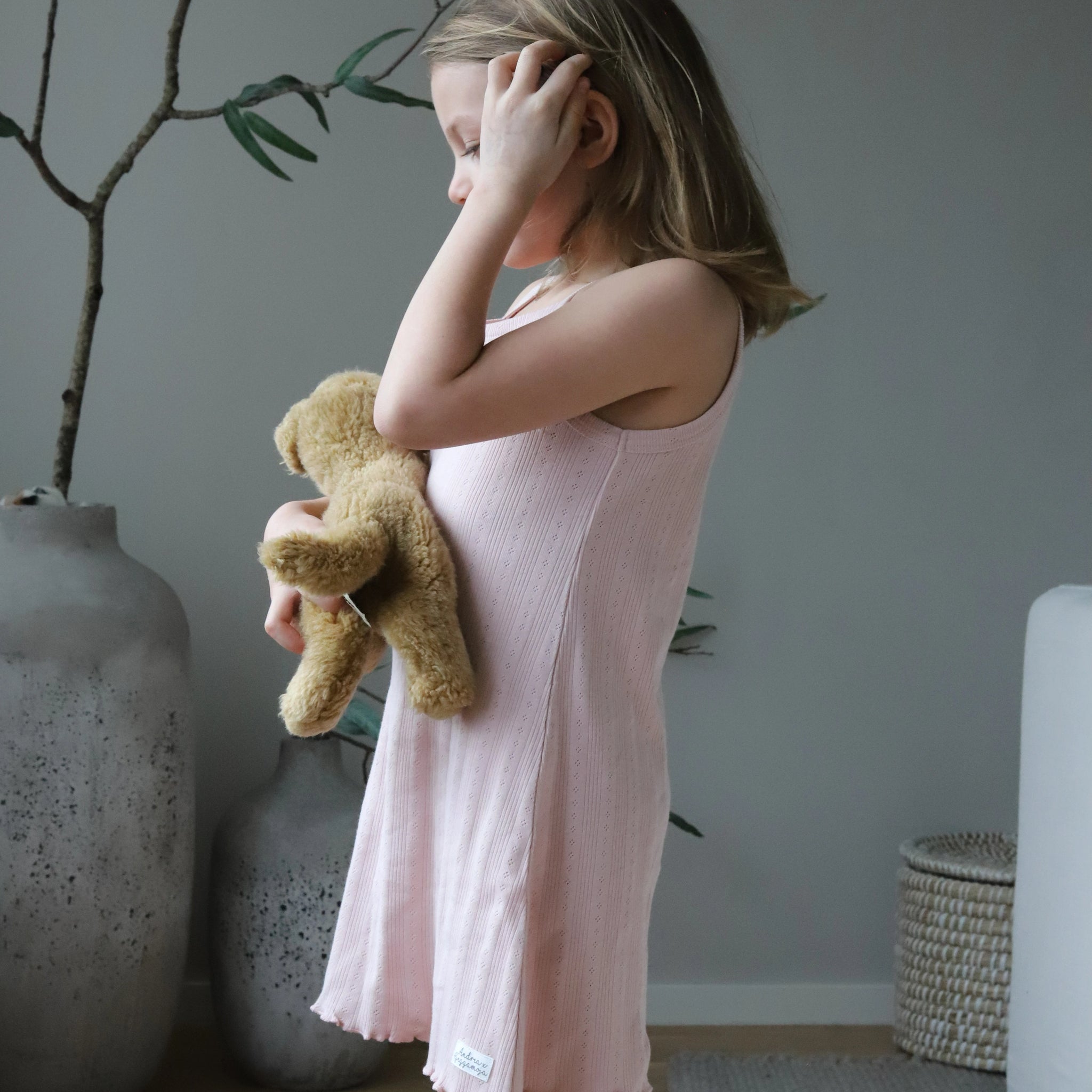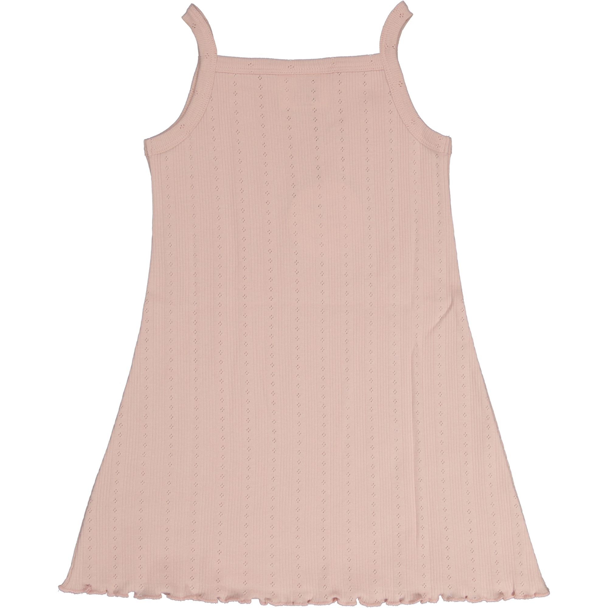 Kjole i rosa pointelle. Pointelle er et strikket stoffmønster som kan sammenlignes med blonder. Stoffet blir lett og luftig og dekorativt.