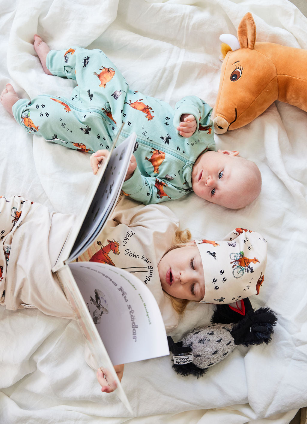 Tvådelad pyjamas med Mamma Mu i mjuk och skön Ekologisk bomull. Pyjamasen består av ett par byxor med resår i midjan och breda muddar och en långärmad tröja även den med muddar.