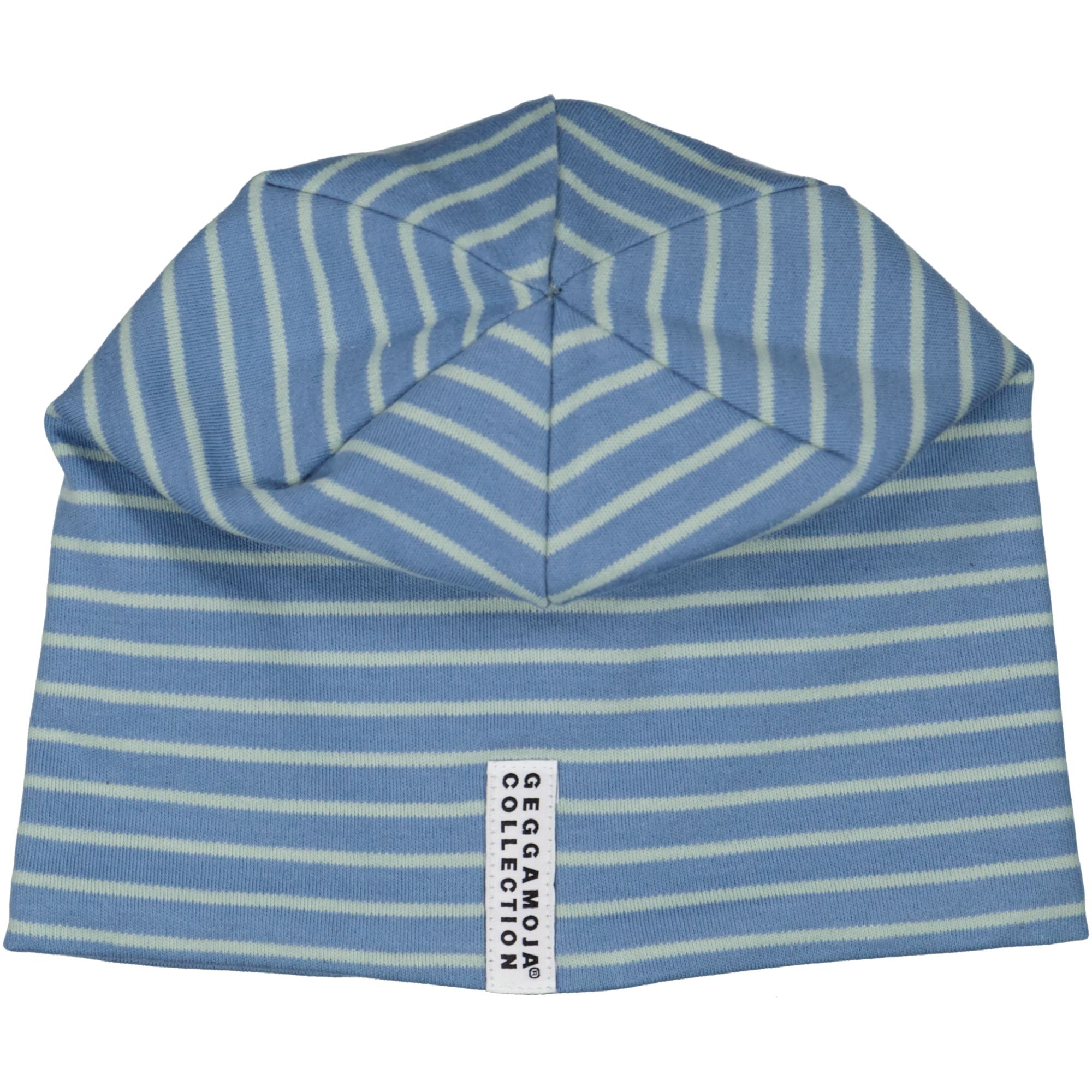 Geggamojas klassiska mössa i blå och grönrandig -bomull! Denna med mjukt fleecefoder som värmer kalla höst- och vintertider.