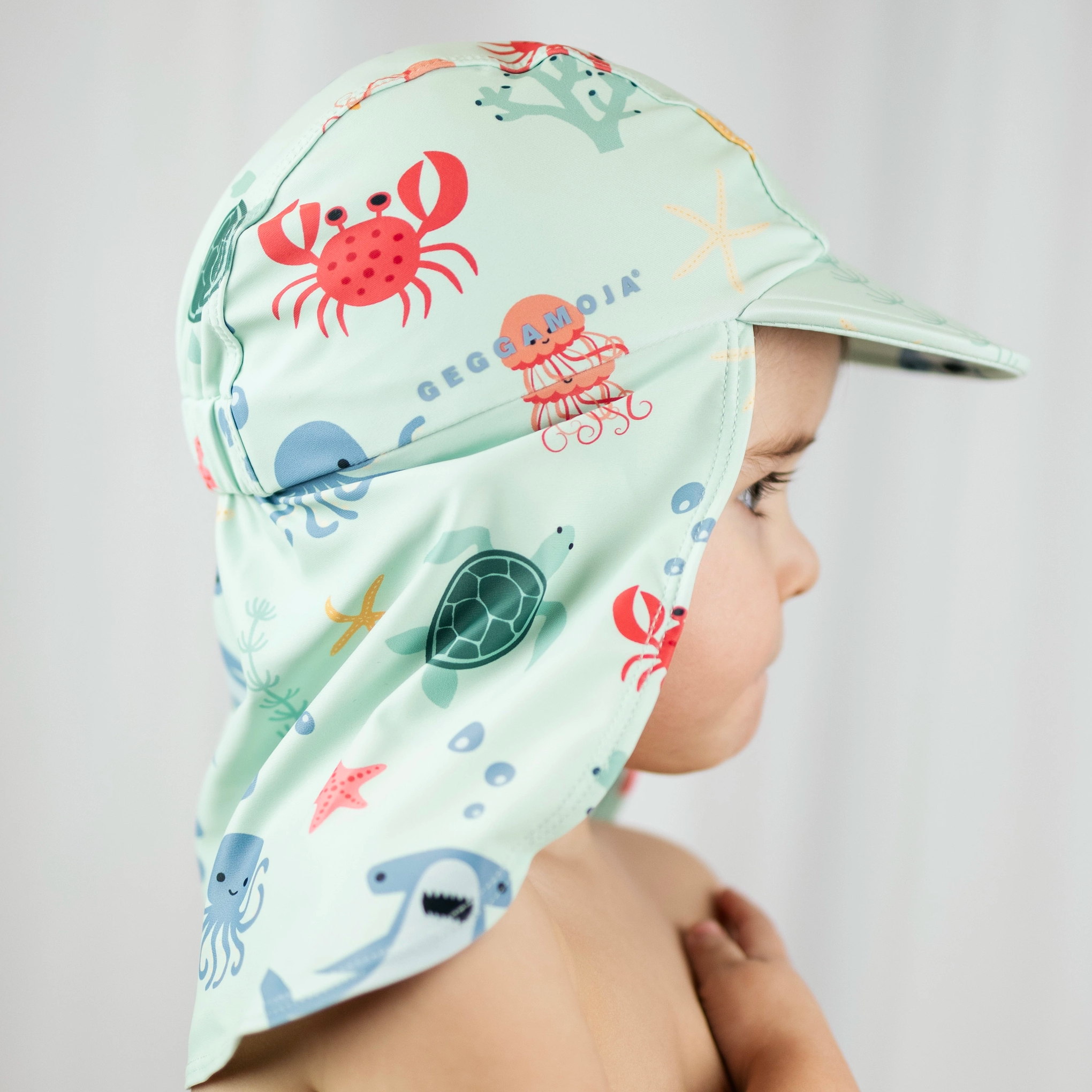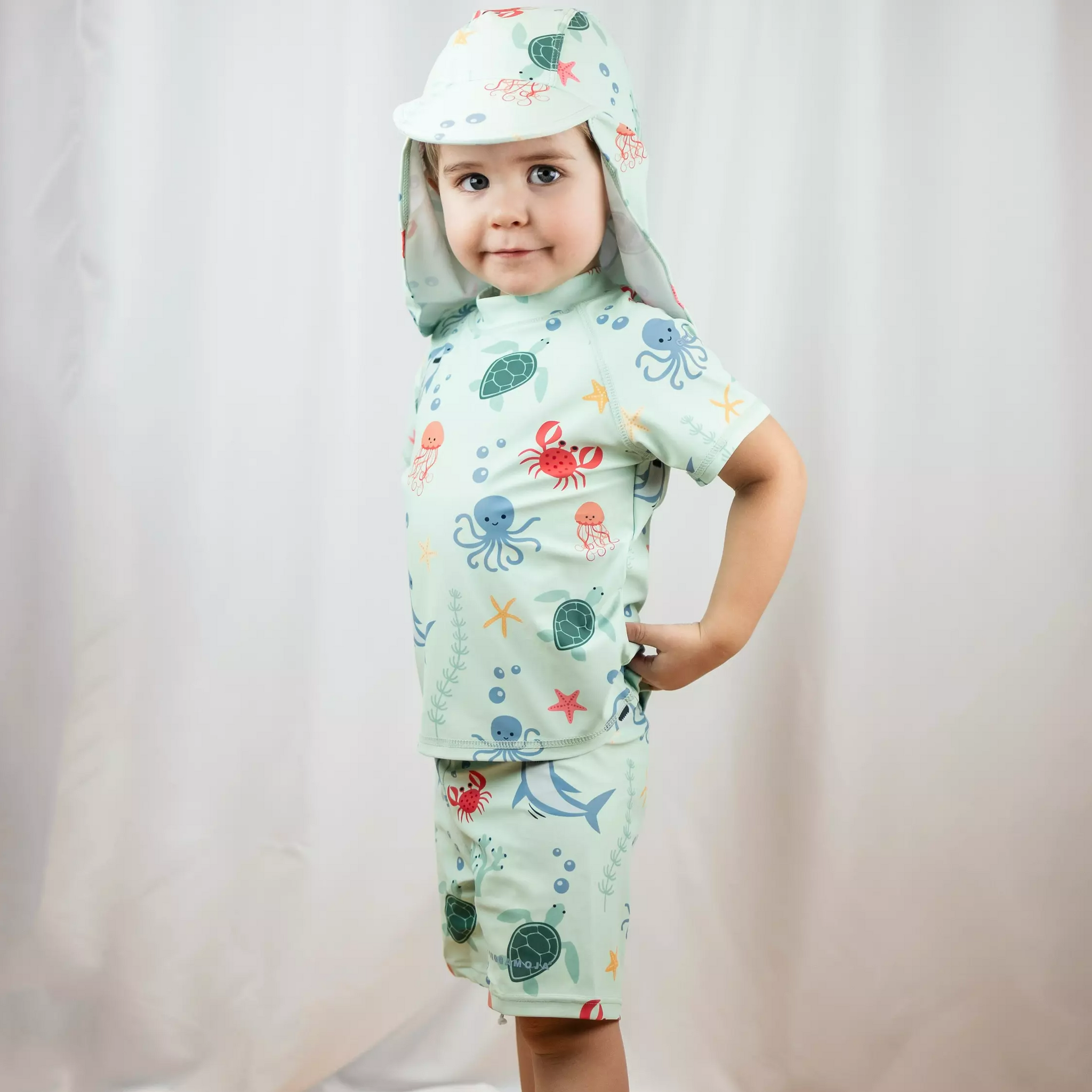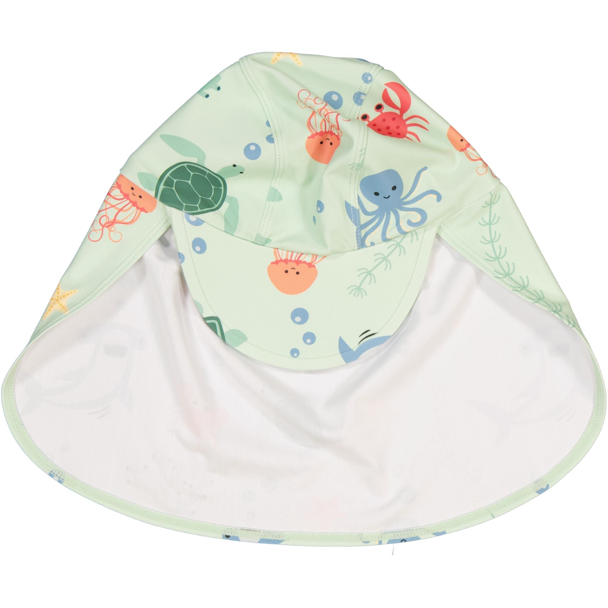 Skydda ditt barns huvud med en UV-Solhatt. Solhatten och är tillverkad i ett snabbtorkande material med UV50+ som blockerar 98% av solens farliga UVA- och UVB-strålar. Solhatten har en skärm och cape för extra skydd i ansikte och nacke.