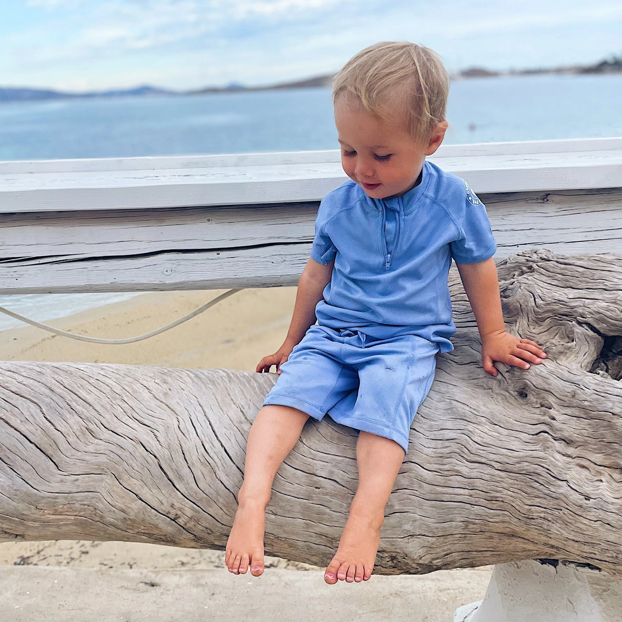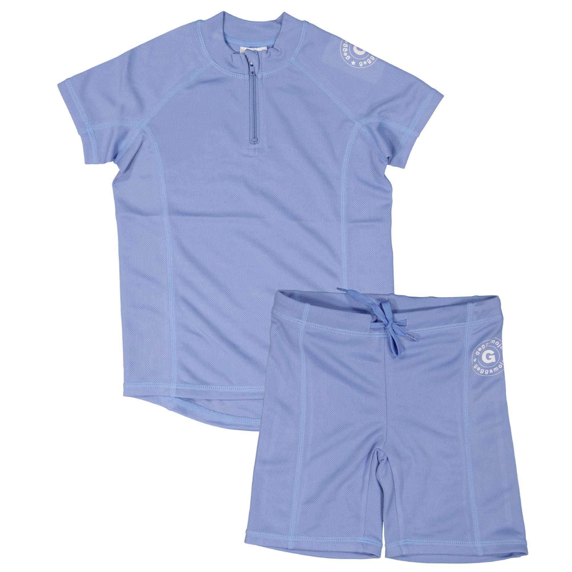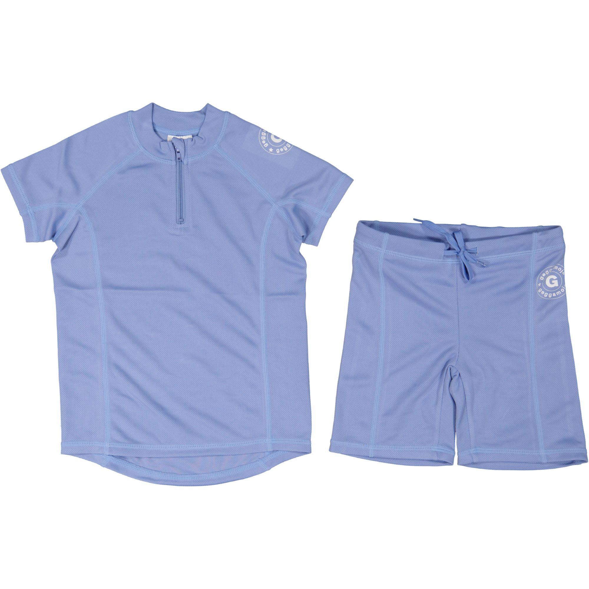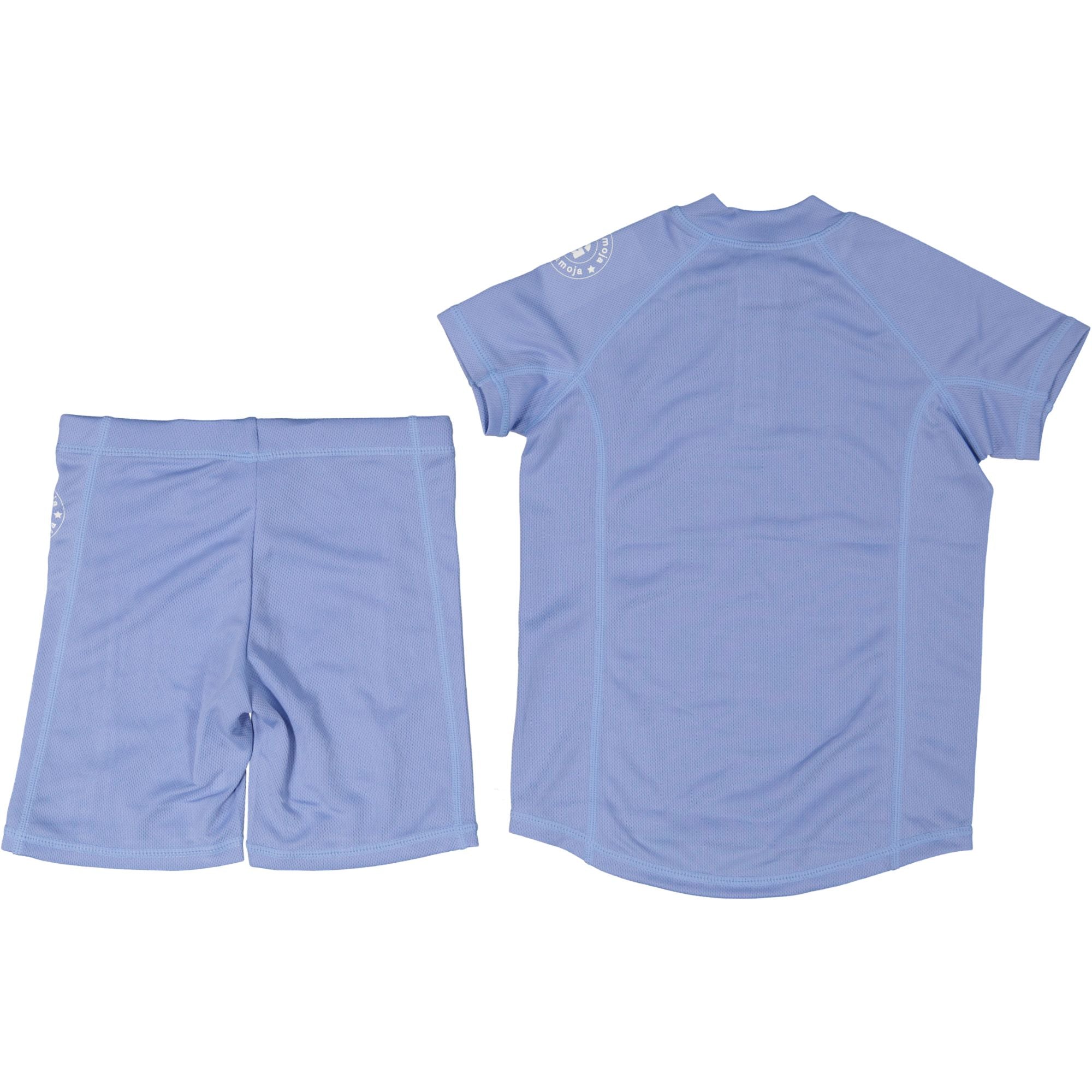 Blått UV- badset med kortärmad tröja och shorts. Det är tillverkad i ett snabbtorkande material, med UV-50+ som blockerar 98% av solens farliga UVA- och UVB-strålar. En storfavorit hos barnfamiljer. Med ett UV-set skyddar du ditt barn från solen starka stålar både vid poolen eller på stranden. Tröjan har en dragkedja framtill för enkel på och avklädnad.