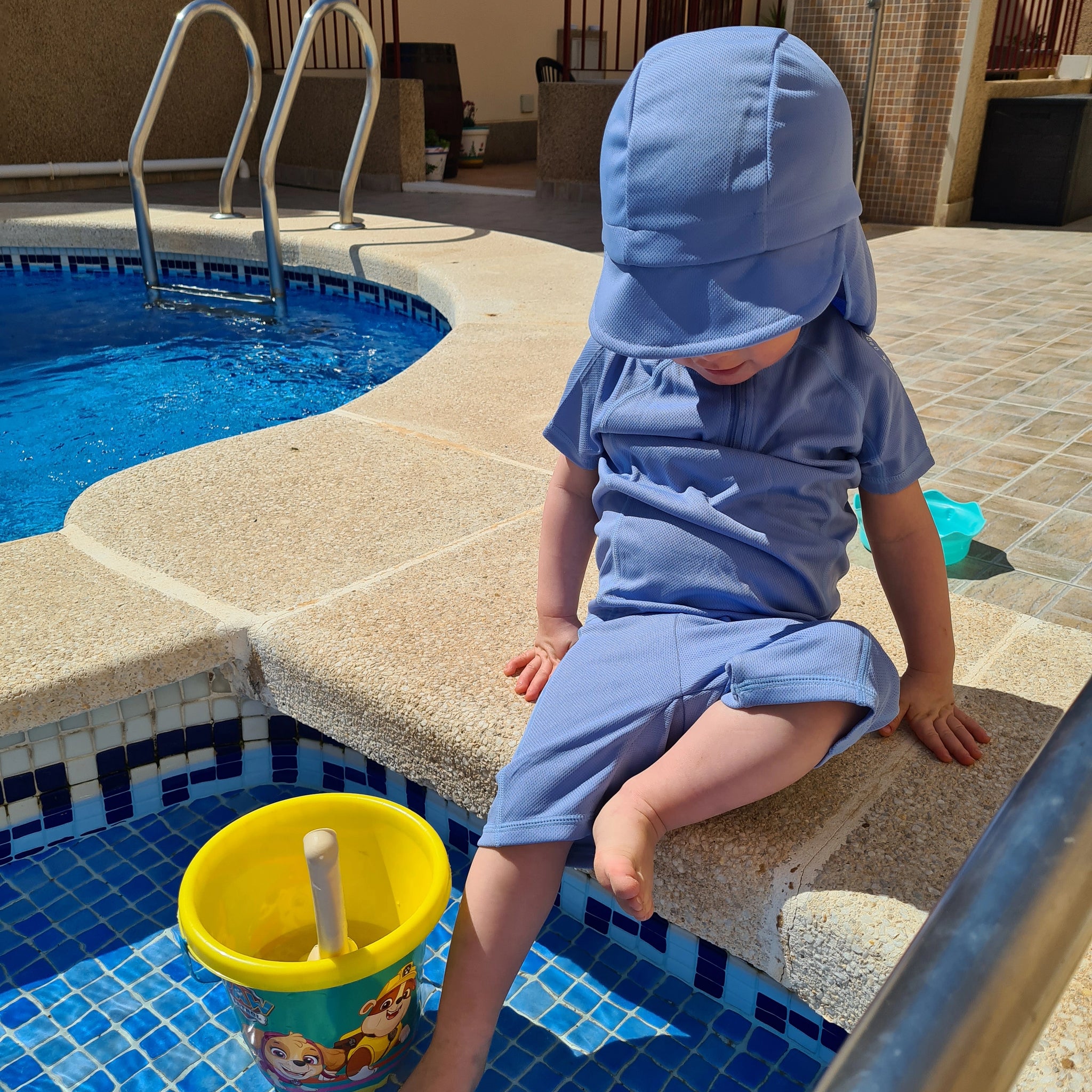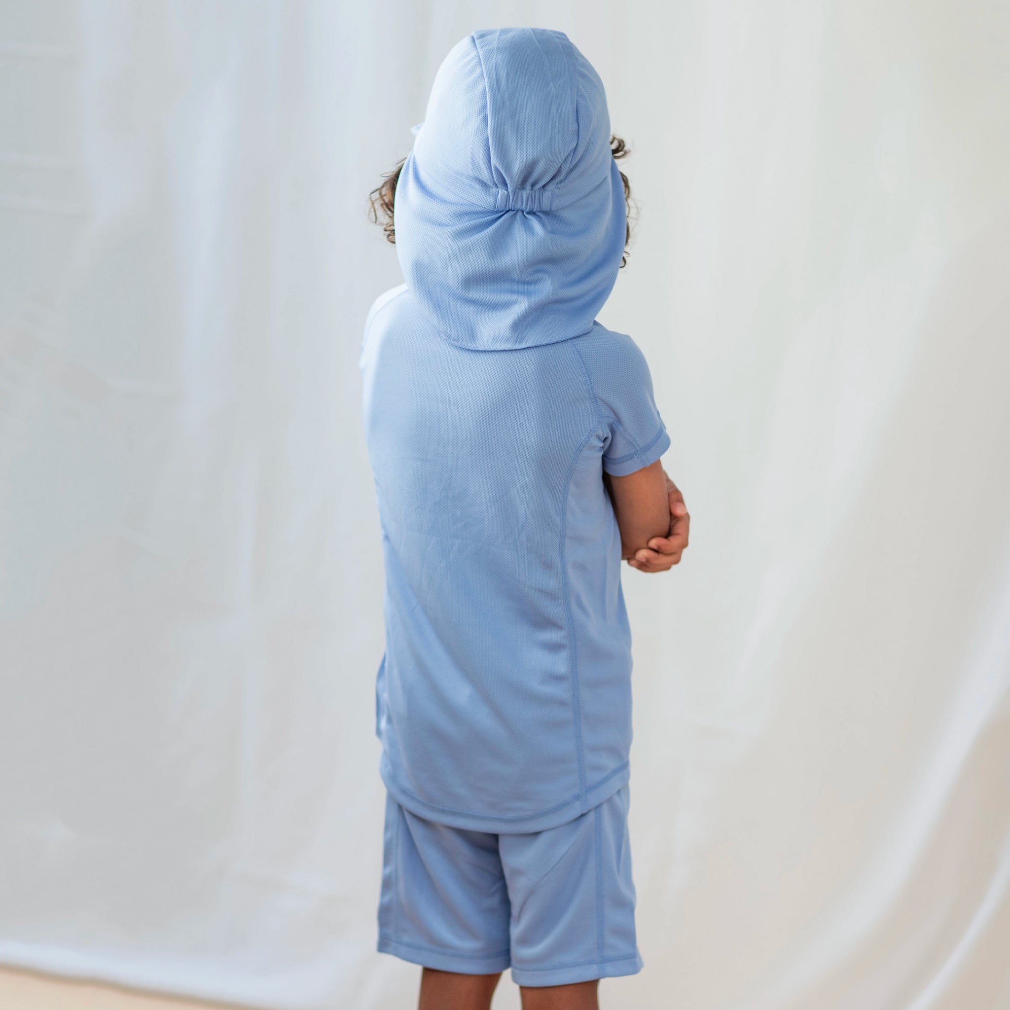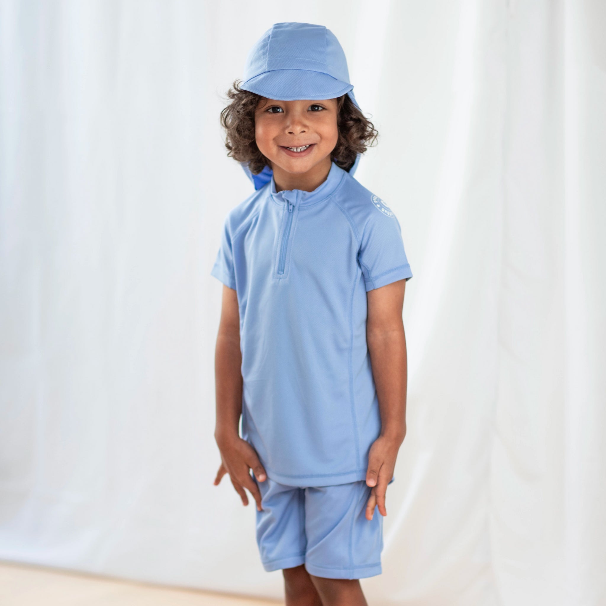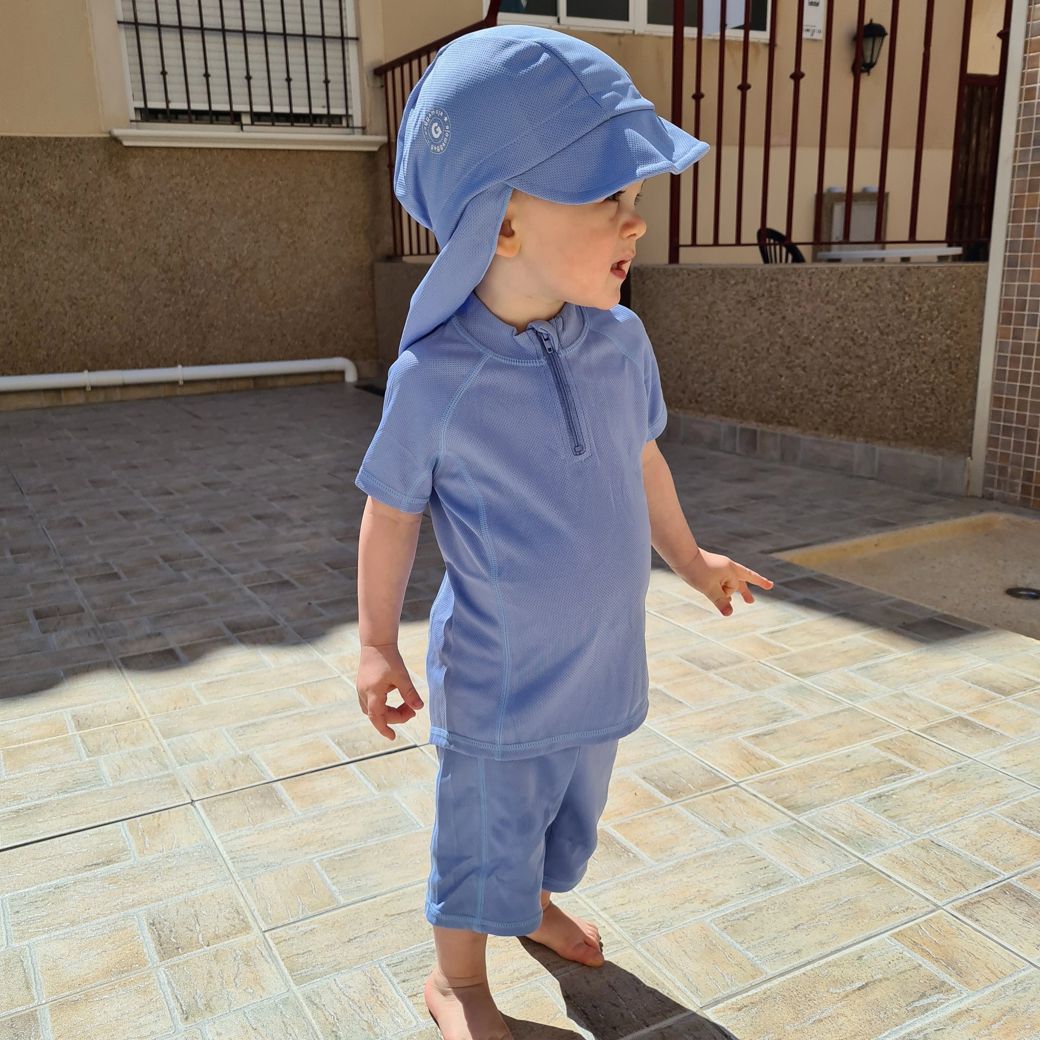 Blått UV- badset med kortärmad tröja och shorts. Det är tillverkad i ett snabbtorkande material, med UV-50+ som blockerar 98% av solens farliga UVA- och UVB-strålar. En storfavorit hos barnfamiljer. Med ett UV-set skyddar du ditt barn från solen starka stålar både vid poolen eller på stranden. Tröjan har en dragkedja framtill för enkel på och avklädnad.