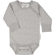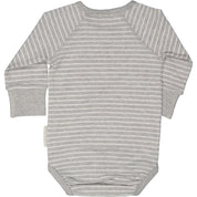 En gråmelerad och vitrandig body i vår populära bambu/bomull. Tre tryckknappar fram vid vänster axel för att enkelt trä över huvudet och tre tryckknappar i grenen. Bodyn är utrustad med vår Extended size vilket innebär dubbla knapprader i grenen så du kan anpassa passformen samt mjuk mudd i ärmslutet som går att vika upp. Detta gör att bodyn passar mycket längre.