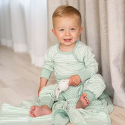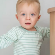 En ljusgrön och grön randig body i vår populära bambu/bomull. Tre tryckknappar fram vid vänster axel för att enkelt trä över huvudet och tre tryckknappar i grenen. Bodyn är utrustad med vår Extended size vilket innebär dubbla knapprader i grenen så du kan anpassa passformen samt mjuk mudd i ärmslutet som går att vika upp. Detta gör att bodyn passar mycket längre.