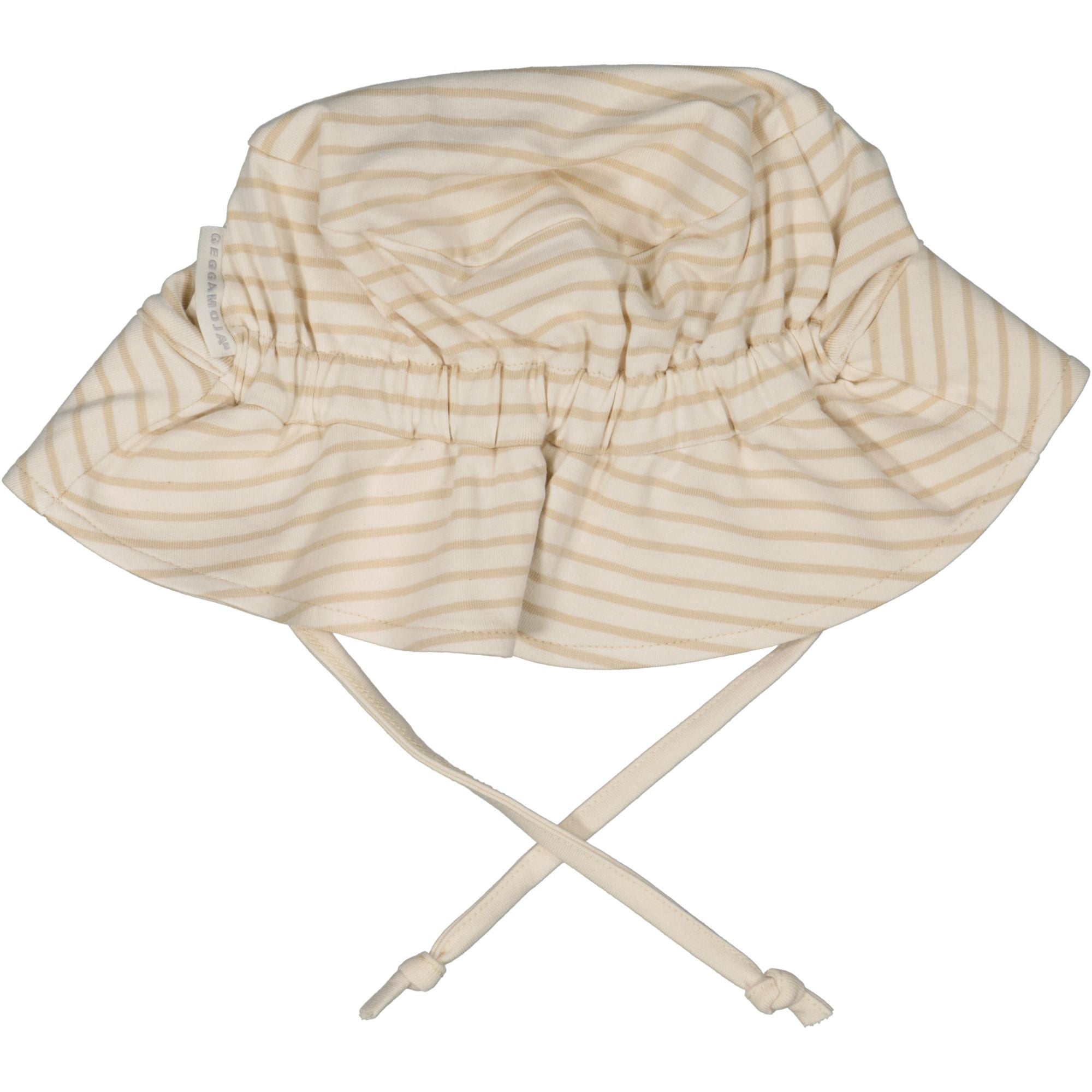 Skydda ditt barns huvud med en UV-Solhatt i vita och beiga ränder, resår i bak och knytsnören som håller den på plats. Solhatten är tillverkad i en sval bambu/bomull. För bästa passformen har solhatten snören för knyt under hakan samt resår på baksidan.