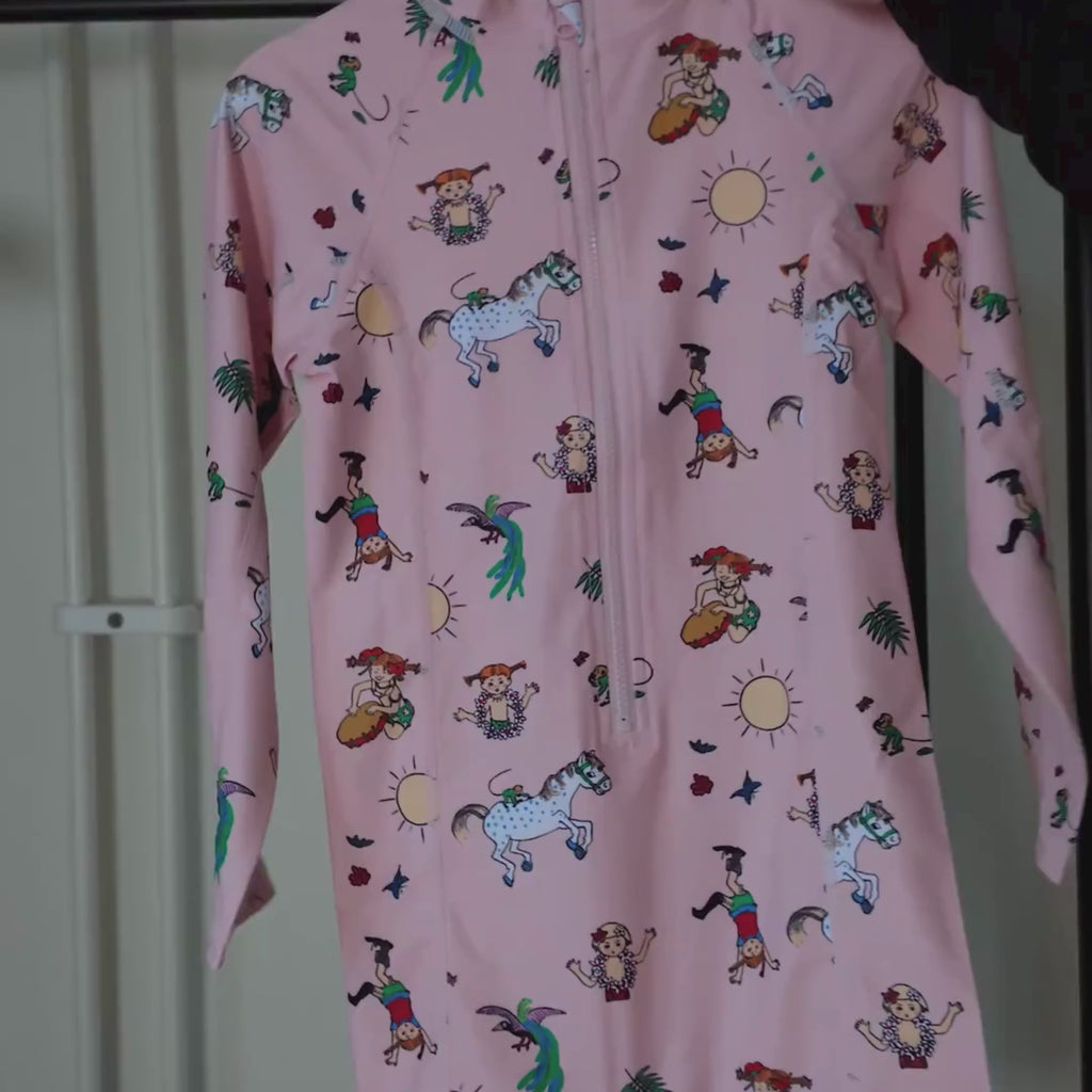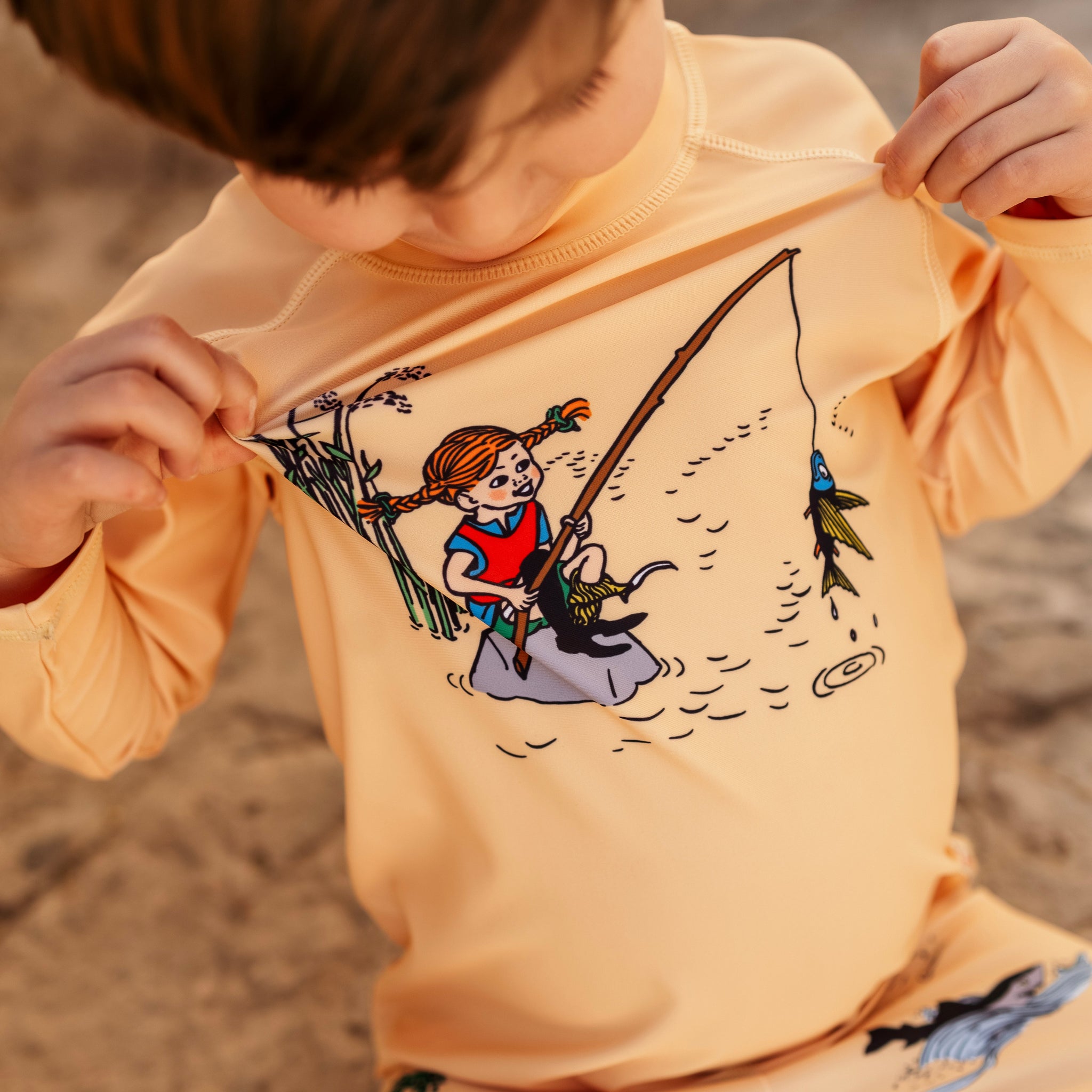 UV bad-set med Pippi-motiv långärmad tröja och shorts. Det är tillverkad i ett snabbtorkande material, med UV-50+ som blockerar 98% av solens farliga UVA- och UVB-strålar. En storfavorit hos barnfamiljer. Med ett UV-set skyddar du ditt barn från solens starka strålar.