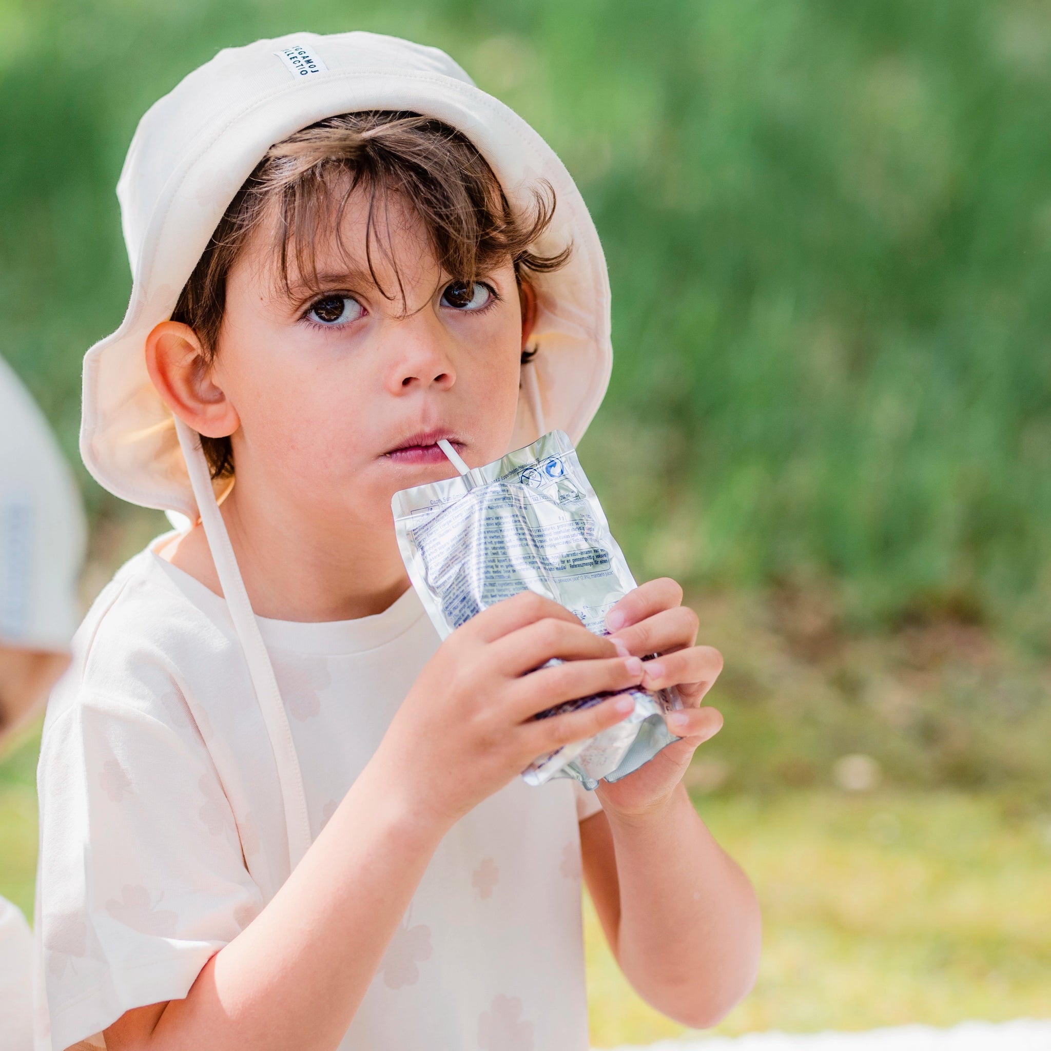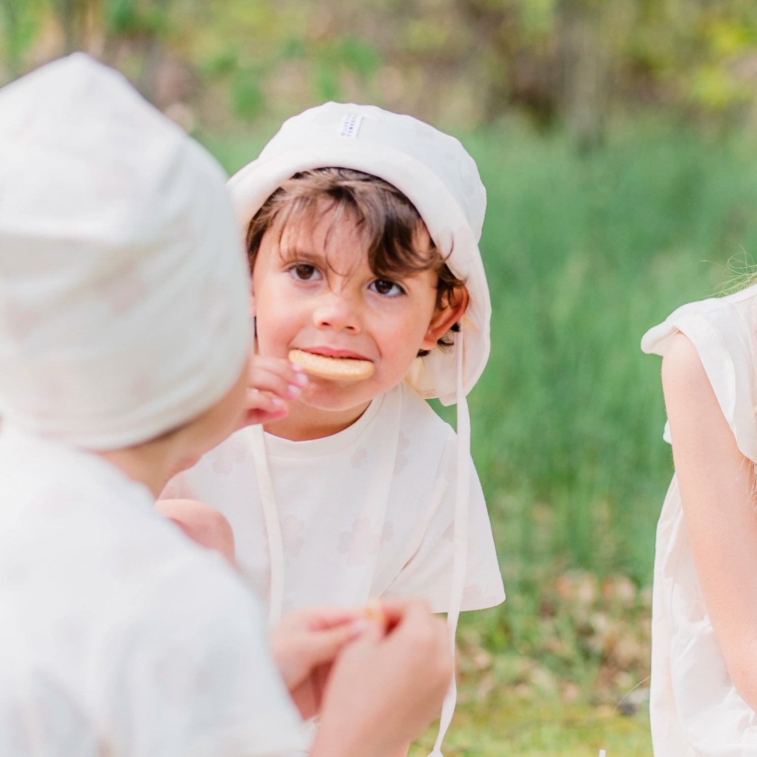 En solhatt tillverkad i skön bambu/bomull. För bästa passformen har solhatten snören för knyt under hakan samt resår på baksidan.