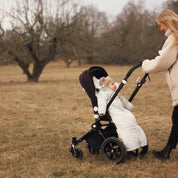 Unik är baksidans band-funktion som hjälper till att reglera åkpåsens placering i barnvagnen.