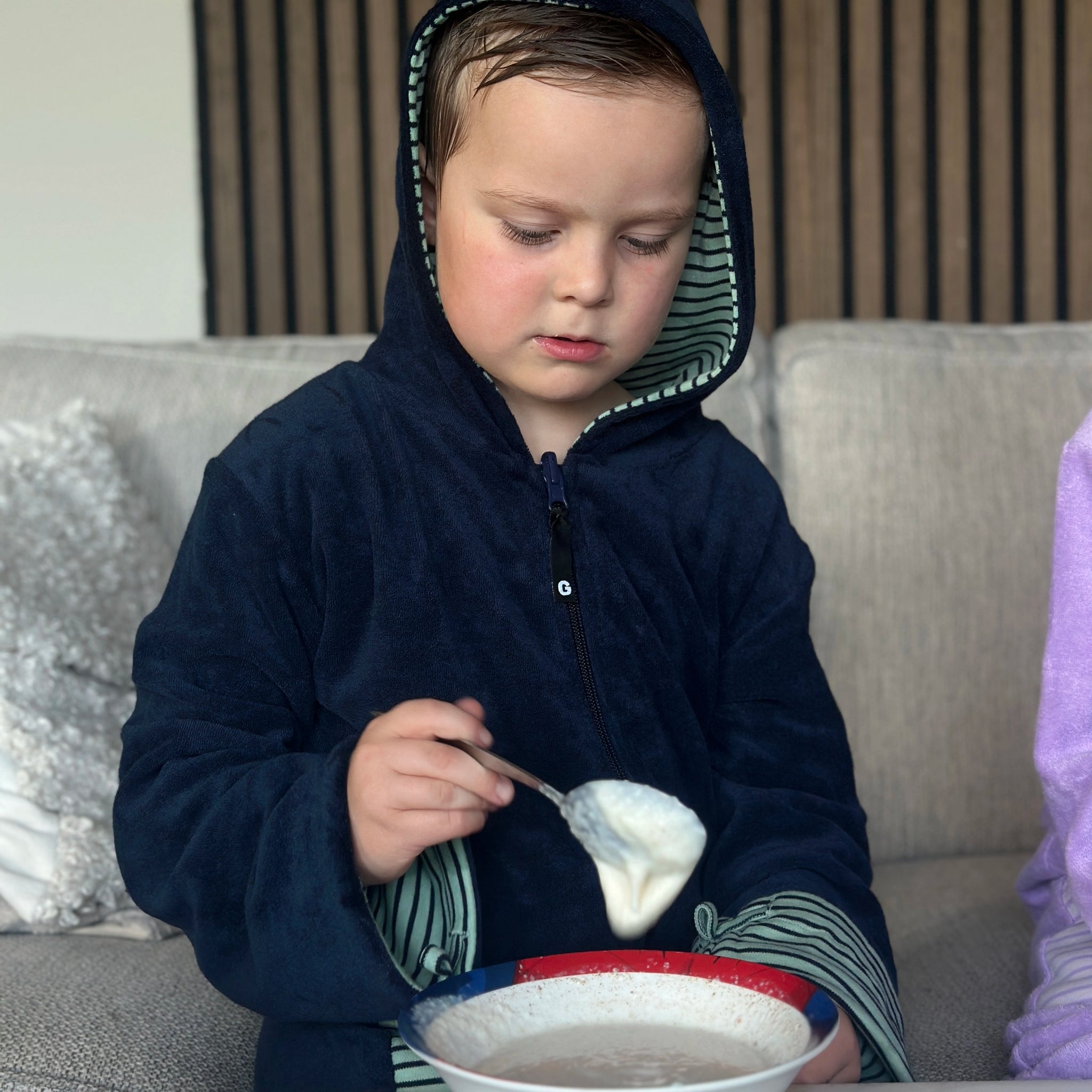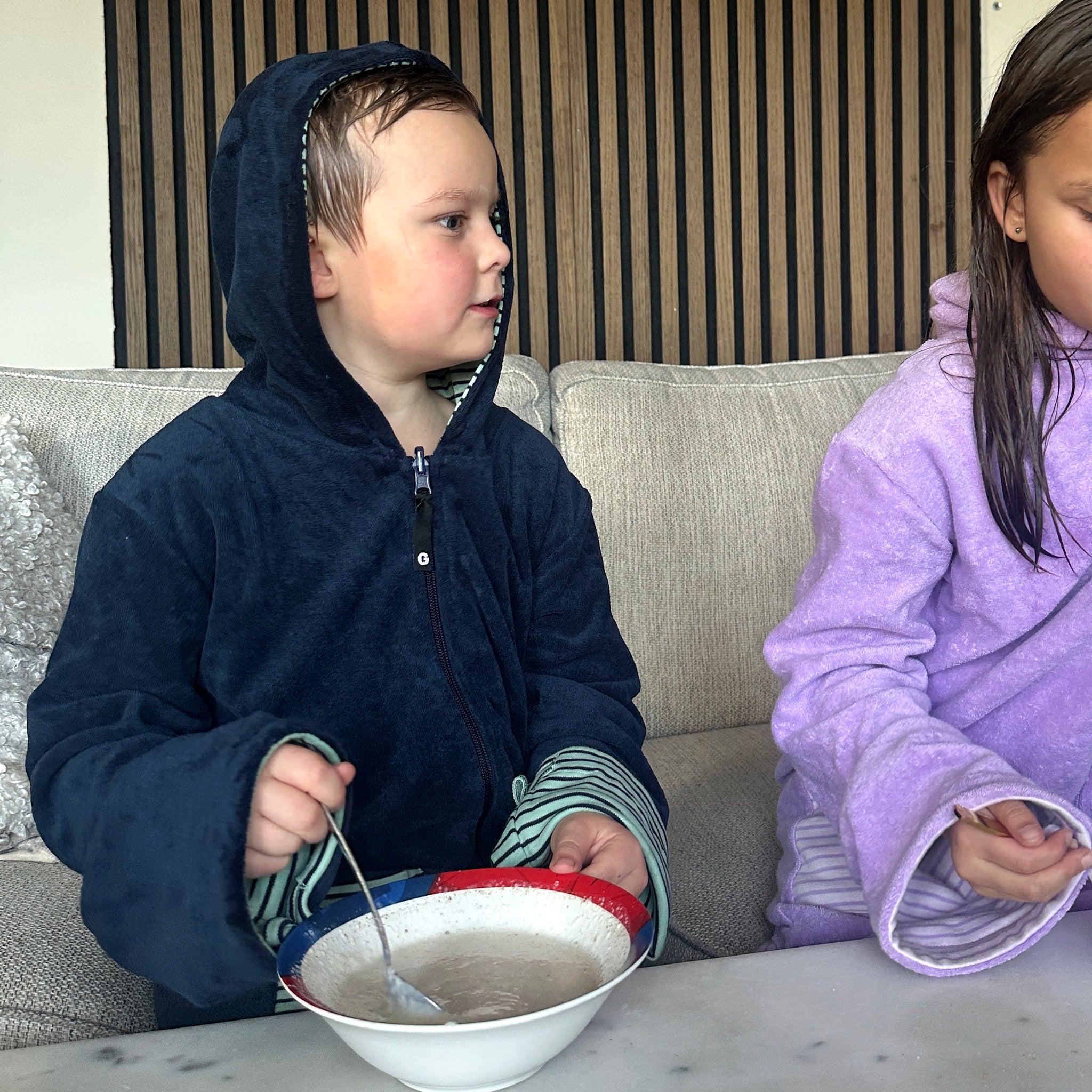 Stor i storleken, långa ärmar. Mysigt plagg perfekt efter bad och dusch. Omtyckt av barnen.