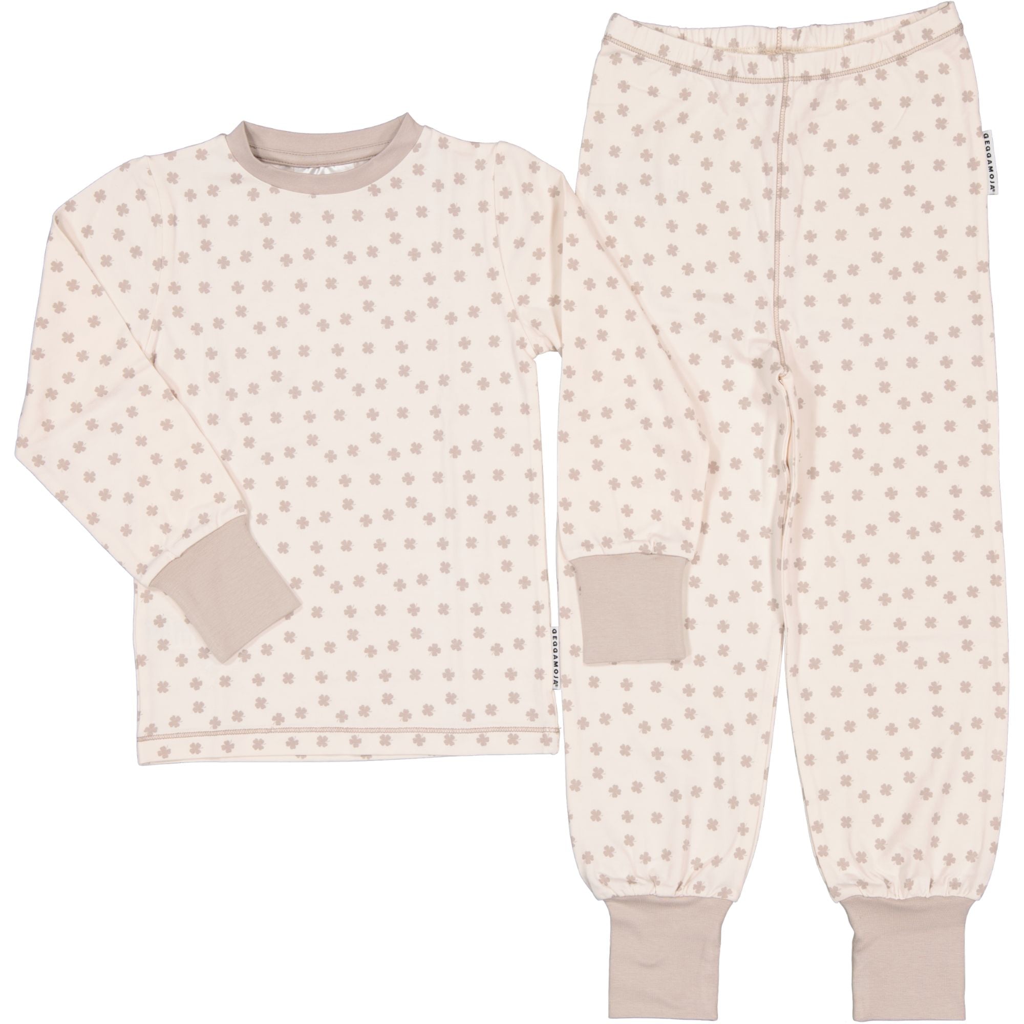 Tvådelad pyjamas i bambu med klövermönster – ett mjukt set som passar lika bra för natten som för lugna dagar hemma.  Pyjamasen består av ett par byxor med resår i midjan och breda muddar och en långärmad tröja även den med muddar.